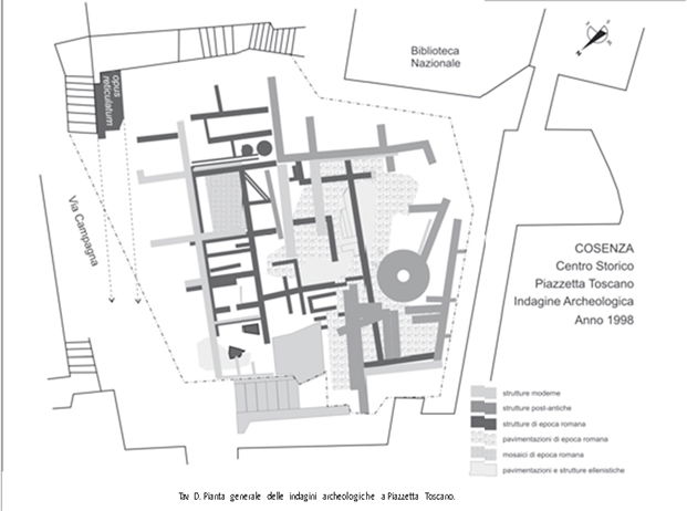 Piazzetta Toscano è un palinsesto unico, il luogo che forse più di ogni altro a Cosenza racconta secoli di storia stratificati. Questo non era uno spazio vuoto, ma il cuore di un ricco quartiere residenziale dell'antica Consentia, un brulicare di case e di affari.